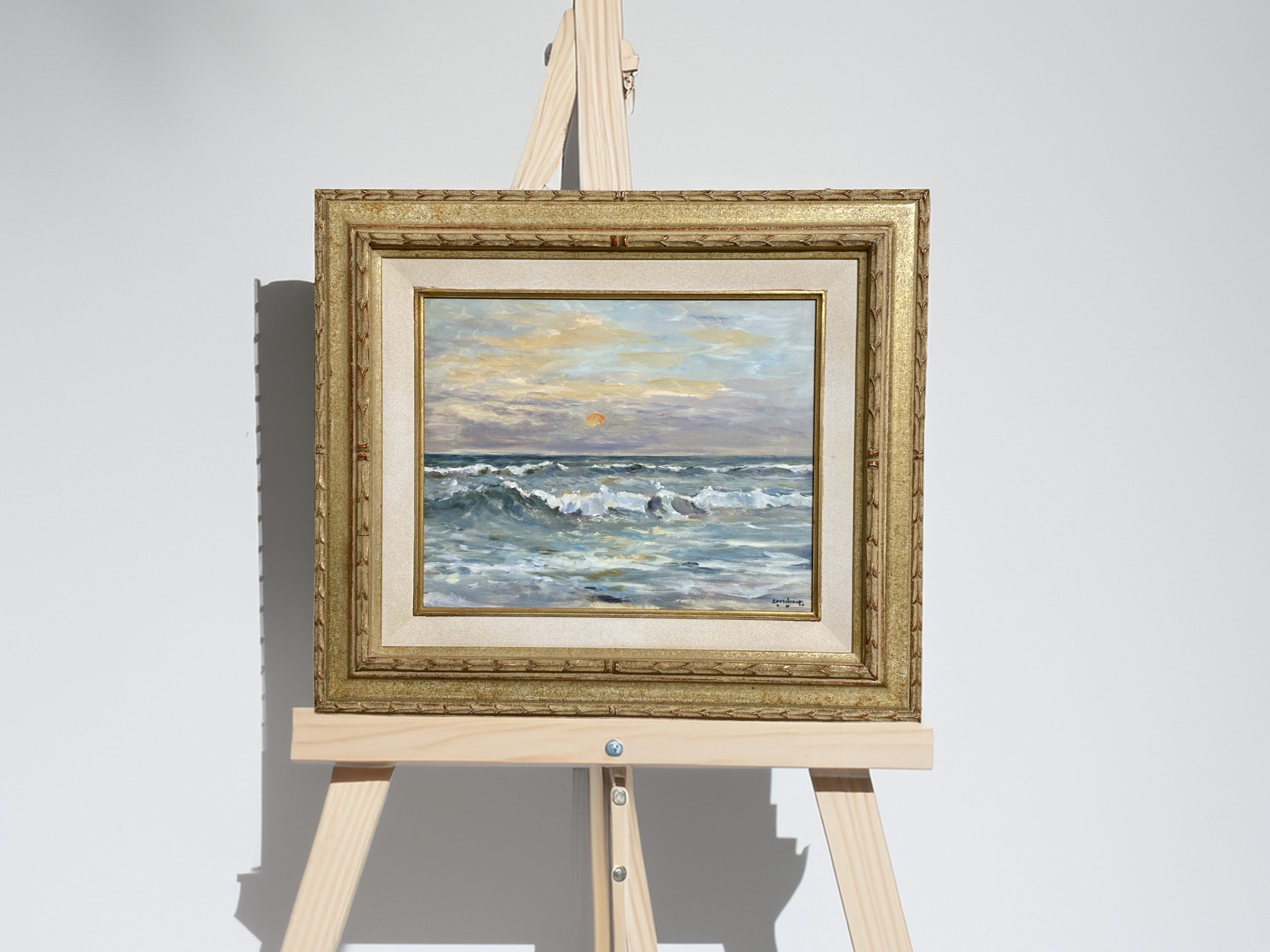Cor Schaap (1968) is een Hollandse kunstschilder die woont en werkt in Katwijk aan Zee. Met olieverf als zijn voornaamste medium schildert hij in een impressionistische en postimpressionistische stijl. Zijn werken zijn sterk geïnspireerd door de kust, met strandtaferelen en zeegezichten als terugkerende thema’s. Dit betreft een fraai olieverfschilderij van de zee met ondergaande zon. In een fraaie handgemaakte omlijsting.